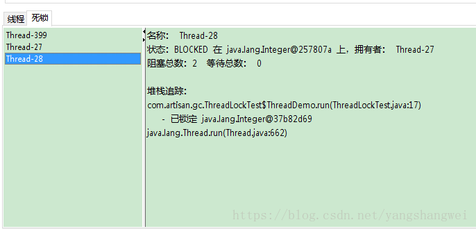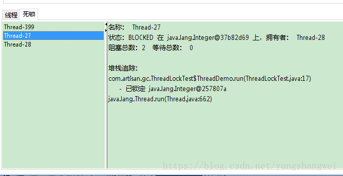 可以看到Thread-27和Thread-28互相阻塞,已经没有等到锁释放的希望了。