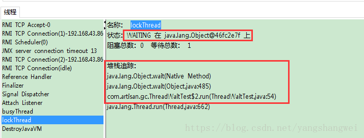 lockThread线程正在处于正常的活锁等待,只要lock对象的notify或者notifyAll方法被调用,这个线程便可以继续执行。
