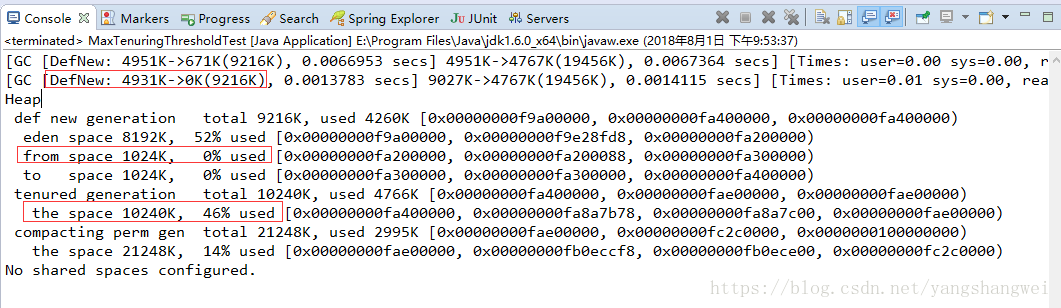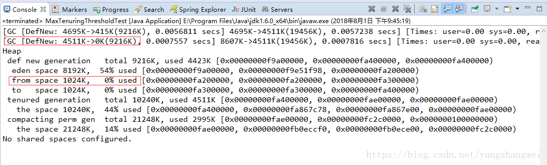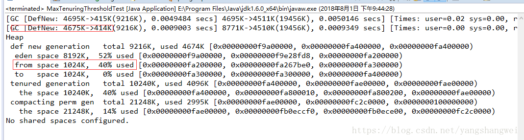 from space 使用了40% ,存放的是object1对象,因没达到XX:MaxTenuringThreshold,暂时还没有清理到老年代。
