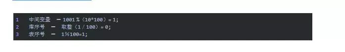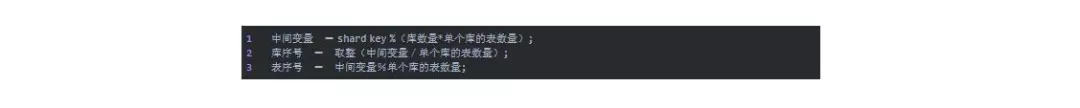 中间变量 = shard key %(库数量*单个库的表数量);2库序号 = 取整(中间变量/单