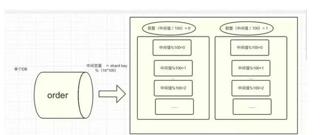我们假设预估单个库需要分配100个表满足我们的业务需求,我们可以简单的取模计算出订单在哪个子表中,例如: order_id % 100,