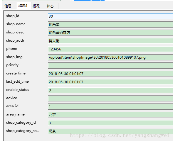 <== Columns: shop_id, shop_name, shop_desc, shop_addr, phone, shop_img, priority, create_time, last_edit_time, enable_status, advice, area_id, area_name, shop_category_id, shop_category_name