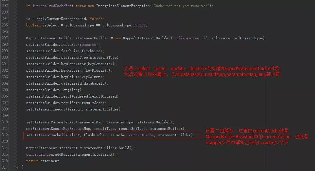 这段代码前面都是解析一些标签的属性,我们看到了最后一行使用builderAssistant添加MappedStatement,其中builderAssistant属性是构造XMLStatementBuilder的时候通过XMLMappedBuilder传入的,我们继续看builderAssistant的addMappedStatement方法: