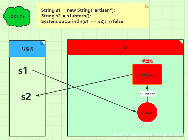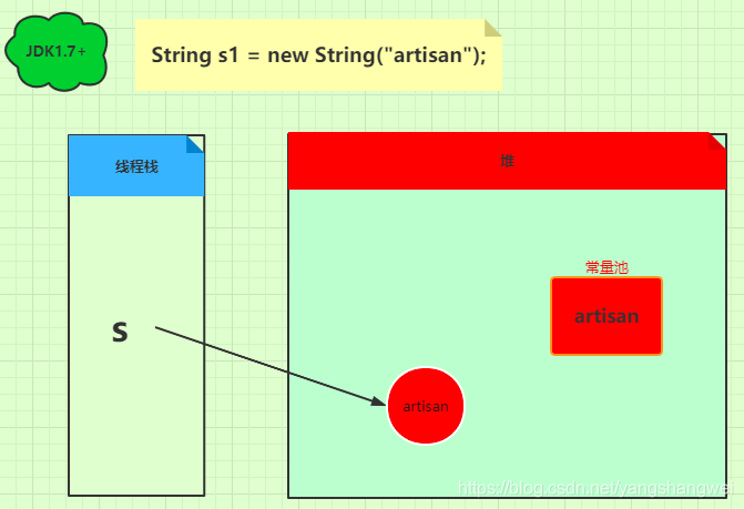 String s1 = new String("artisan"); // s1指向内存中的对象引用