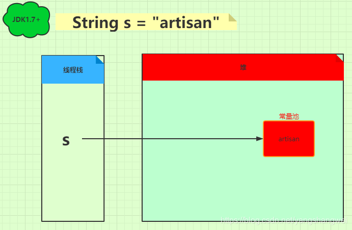 因为有"artisan"这个字面量,创建对象s的时候,JVM会先去常量池中通过 equals(key) 方法,判断是否有相同的对象