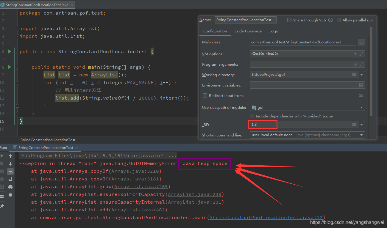 看 1.8 , 疯狂的intern, 抛出了 heap oom ,由此可以推断出 1.8中的字符串常量池 是在堆中。