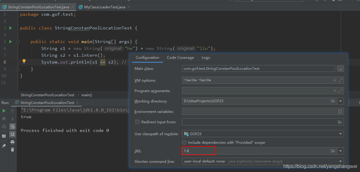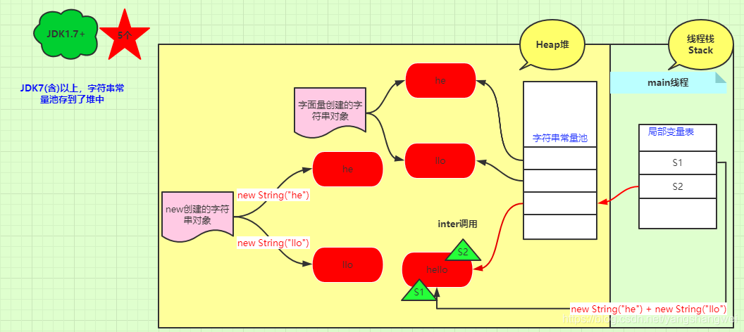 //"test"作为字面量,放入了池中,而new时s1指向的是heap中新生成的string对象,s1.intern()指向的是"test"字面量之前在池中生成的字符串对象