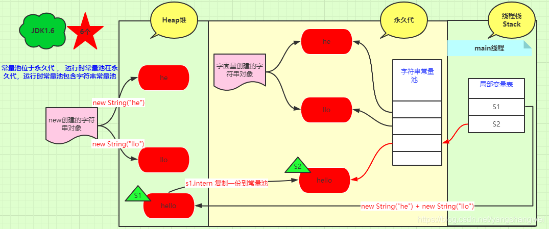 - Jdk1.6及之前: JVM存在永久代, 运行时常量池在永久代,运行时常量池包含字符串常量池