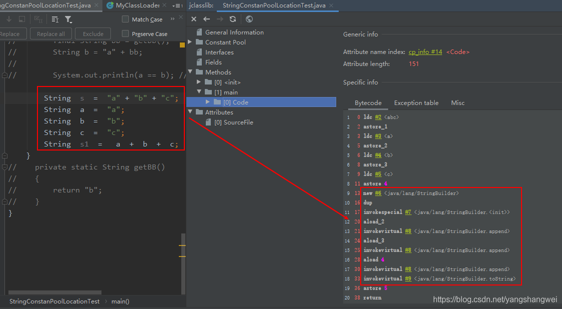 JVM对于字符串引用,由于在字符串的"+"连接中,有字符串引用存在,而引用的值在程序编译期是无法确定的,即"a" + bb无法被编译器优化,只有在程序运行期来动态分配并将连接后的新地址赋给b。所以上面程序的结果也就为false。
