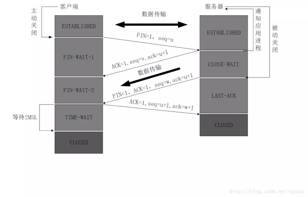 5、客户端收到服务器的连接释放报文后,必须发出确认,ACK=1,ack=w+1,而自己的序列号是seq=u+1,此时,客户端就进入了TIME-WAIT(时间等待)状态。注意此时TCP连接还没有释放,必须经过2??MSL(最长报文段寿命)的时间后,当客户端撤销相应的TCB后,才进入CLOSED状态。