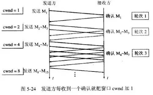 每经过一个传输轮次,拥塞窗口 cwnd 就加倍。一个传输轮次所经历的时间其实就是往返时间RTT。不过“传输轮次”更加强调:把拥塞窗口cwnd所允许发送的报文段都连续发送出去,并收到了对已发送的最后一个字节的确认。