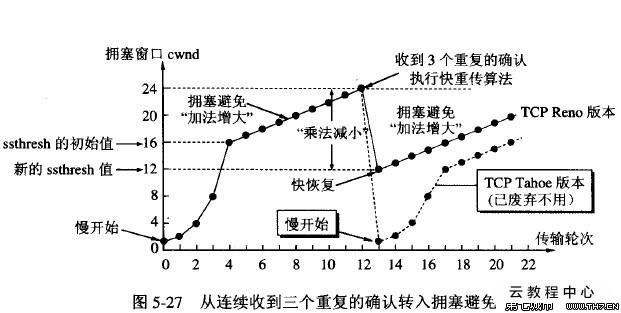 3、假定拥塞窗口的数值增长到24时,网络出现超时(这很可能就是网络发生拥塞了)。更新后的ssthresh值变为12(即变为出现超时时的拥塞窗口数值 24的一半),拥塞窗口再重新设置为1,并执行慢开始算法。当cwnd=ssthresh=12时改为执行拥塞避免算法,拥塞窗口按线性规律增长,每经过 一个往返时间增加一个MSS的大小。
