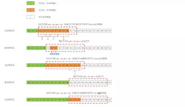 接收方接收到了报文段 A, C,但是没收到 B 和 D,也就是只收到了 [33, 35) 和 [36, 38) 号数据。接收方发送回对报文段 A 的确认:ack = 35, win = 10。