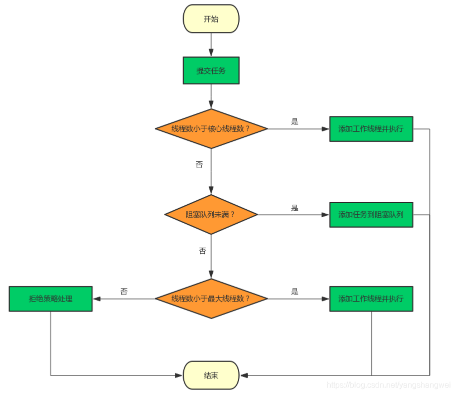 workerCount >= corePoolSize && workerCount < maximumPoolSize,且线程池内的阻塞队列已满,则创建并启动一个线程来执行新提交的任务; - 如果