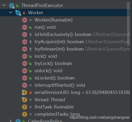 Worker继承了AQS,使用AQS来实现独占锁的功能。为什么不使用ReentrantLock来实现呢?可以看到tryAcquire方法,它是不允许重入的,而ReentrantLock是允许重入的