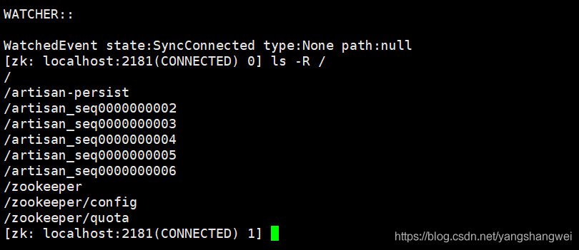 [zk: localhost:2181(CONNECTED) 20] ls -R /artisan-e