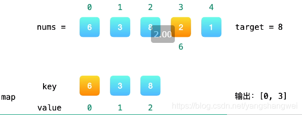遍历数组 nums,i 为当前下标,每个值都判断map中是否存在 target-nums[i] 的 key 值;