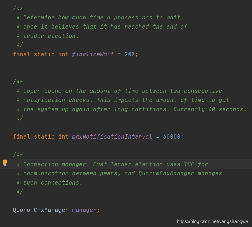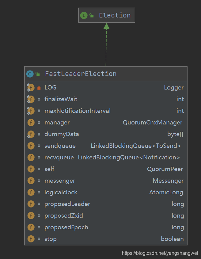 FastLeaderElection 类继承了 Election 接口,定义其是用来进行选举的实现类。而在其内部,又定义了选举通信相关的一些配置参数,比如 finalizeWait 最终等待时间、最大通知间隔时间 maxNotificationInterval 等。