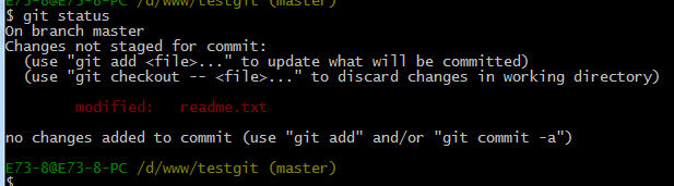我们在readme.txt再添加一行内容为4444444,接着在目录下新建一个文件为test.txt 内容为test,我们先用命令 git status来查看下状态,如下:
