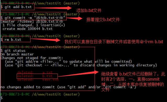 如上:一般情况下,可以直接在文件目录中把文件删了,或者使用如上rm命令:rm b.txt ,如果我想彻底从版本库中删掉了此文件的话,可以再执行commit命令 提交掉,现在目录是这样的,