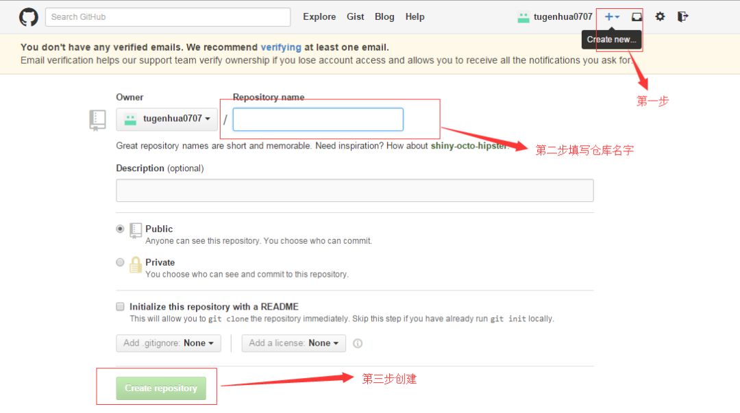 首先,登录github上,然后在右上角找到“create a new repo”创建一个新的仓库。如下: