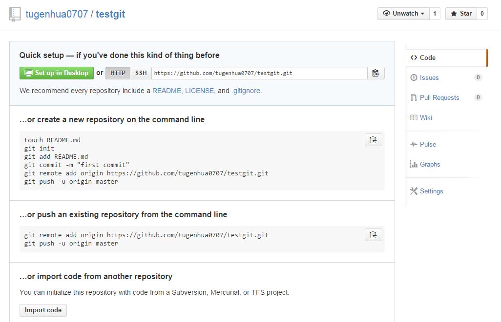现在,我们根据GitHub的提示,在本地的testgit仓库下运行命令:
