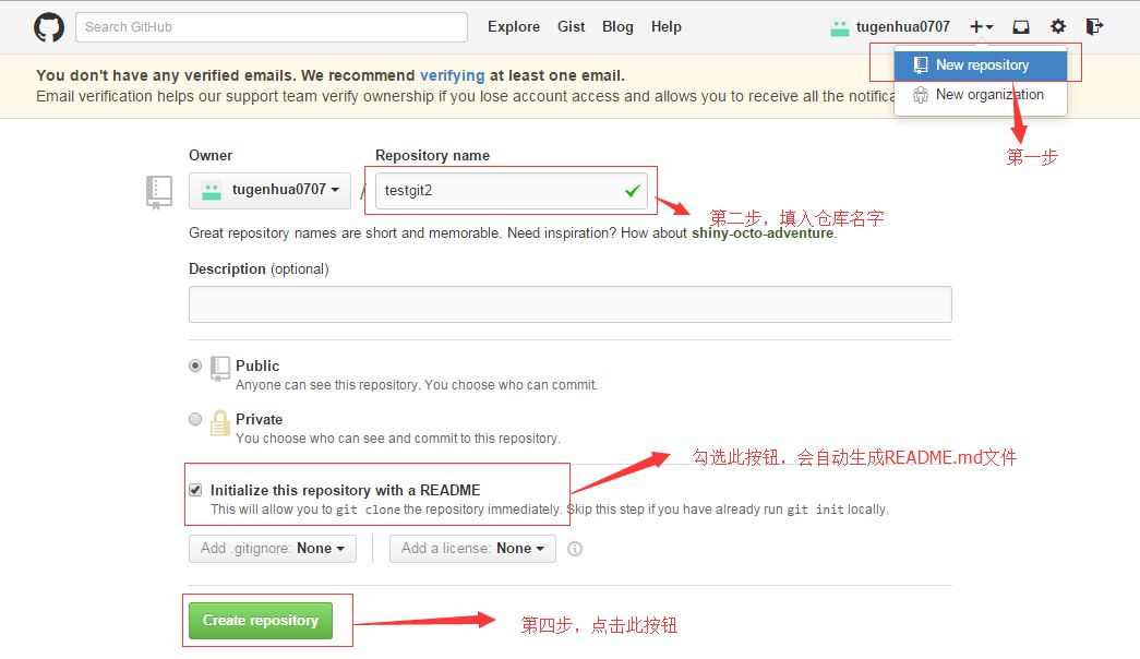 首先,登录github,创建一个新的仓库,名字叫testgit2.如下: