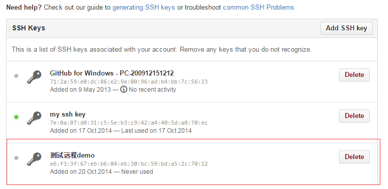 点击 Add Key,你就应该可以看到已经添加的key。