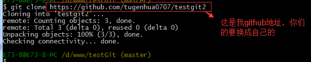 接着进入testgit2目录,进行克隆远程的库到本地来,如下: