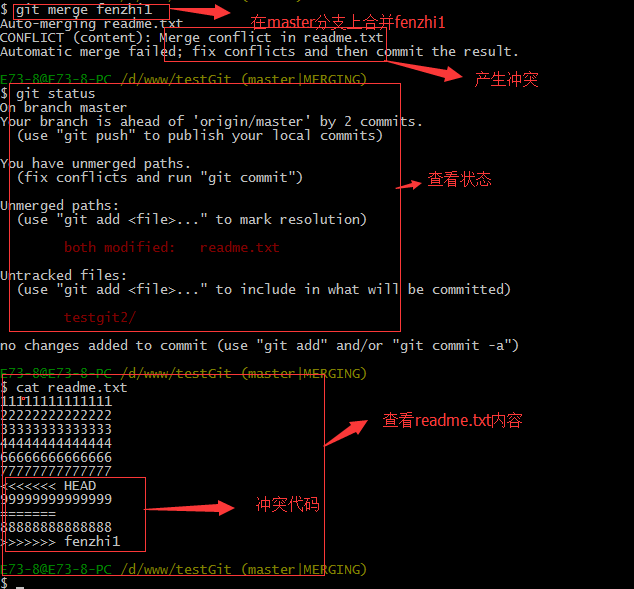现在我们需要在master分支上来合并fenzhi1,如下操作: