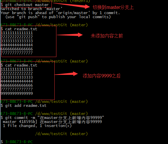 同样,我们现在切换到master分支上来,也在最后一行添加内容,内容为99999999,如下所示: