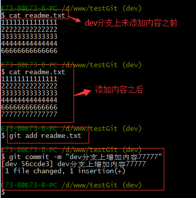 git branch查看分支,会列出所有的分支,当前分支前面会添加一个星号。然后我们在dev分支上继续做demo,比如我们现在在readme.txt再增加一行 7777777777777