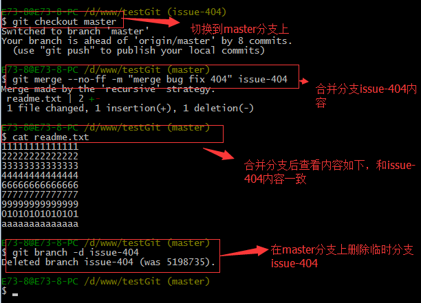 修复完成后,切换到master分支上,并完成合并,最后删除issue-404分支。演示如下: