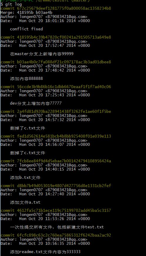 现在我已经对readme.txt文件做了三次修改了,那么我现在想查看下历史记录,如何查呢?我们现在可以使用命令 git log 演示如下所示: