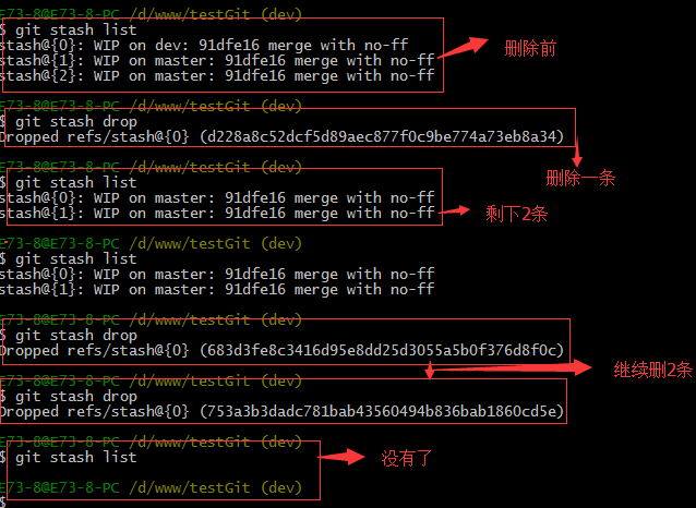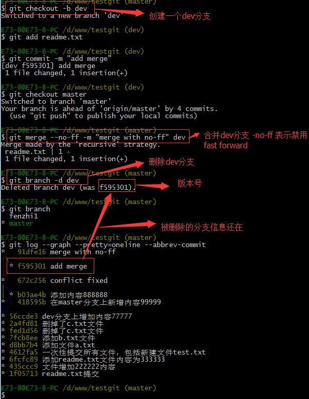 合并完成后,我们可以接着删除dev分支了,操作如下: