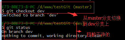 首先,我们来创建dev分支,然后切换到dev分支上。如下操作: