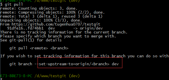 git pull也失败了,原因是没有指定本地dev分支与远程origin/dev分支的链接,根据提示,设置dev和origin/dev的链接:如下: