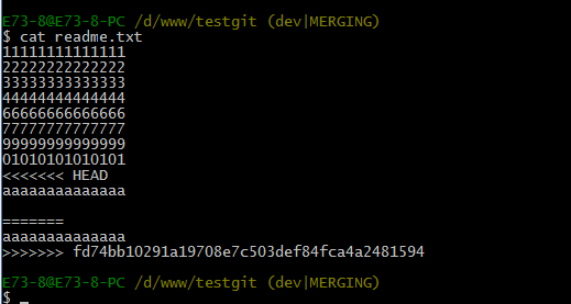 git merge命令用于合并指定分支到当前分支上,合并后,再查看readme.txt内容,可以看到,和dev分支最新提交的是完全一样的。