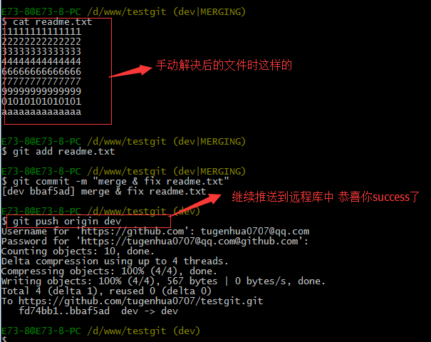 现在手动已经解决完了,我接在需要再提交,再push到远程库里面去。如下所示: