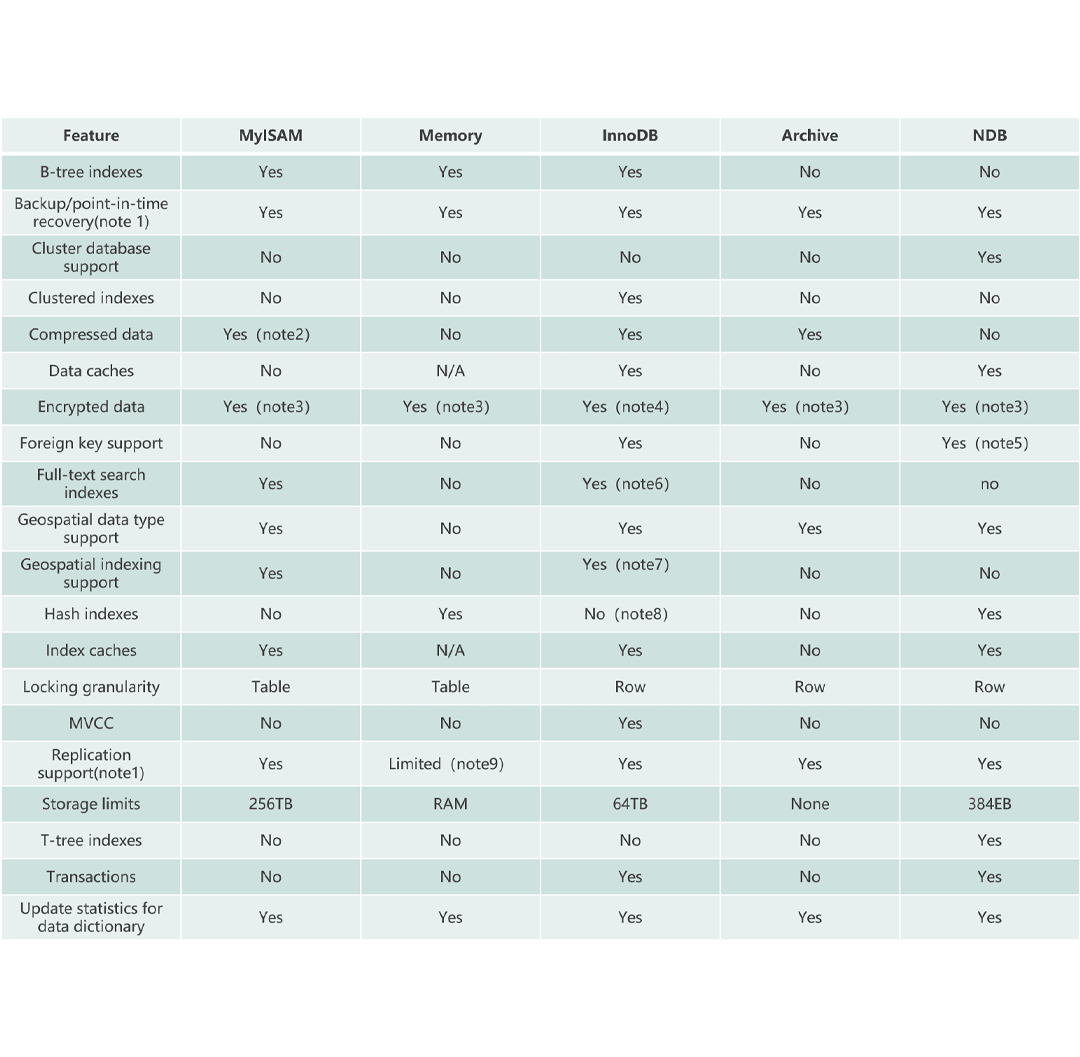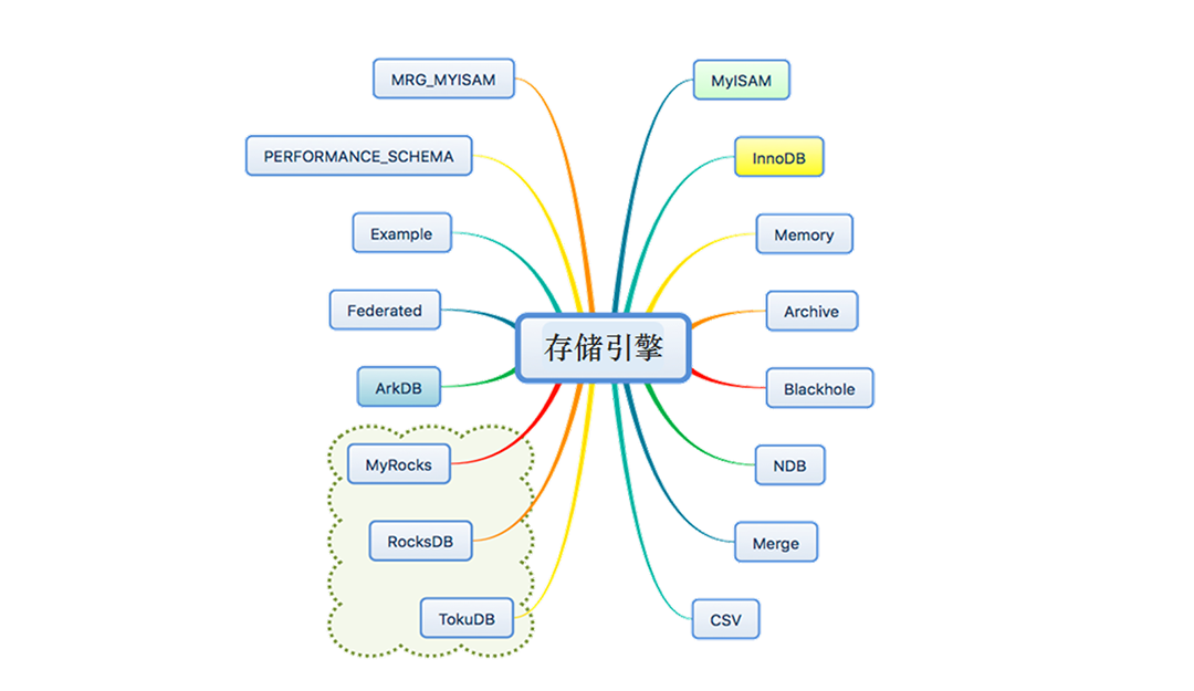 有古老的 MyISAM、支持事务的 InnoDB、内存类型的 Memory、归档类型的 Archive、列式存储的 Infobright,以及一些新兴的存储引擎,以 RocksDB 为底层基础的 MyRocks 和 RocksDB,和以分形树索引组织存储的 TokuDB, 以及国产的分布式存储引擎 ArkDB。