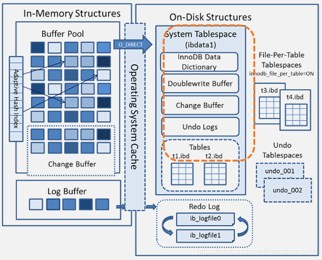 系统表空间里有 ibdata 文件和一些 Undo,ibdata 文件里有 insert buffer 段、double write段、回滚段、索引段、数据字典段和 Undo 信息段。