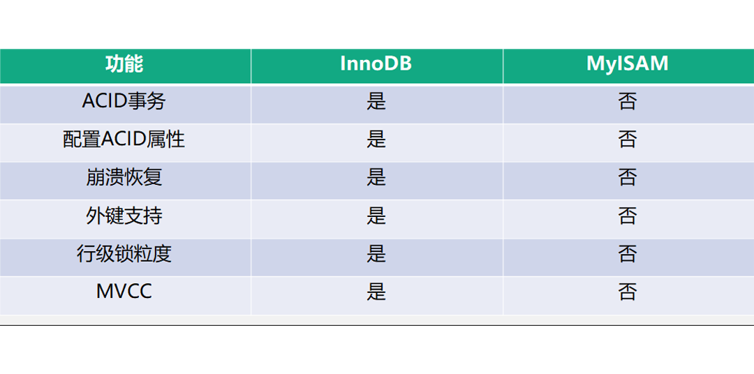 InnoDB 支持 ACID 的事务 4 个特性,而 MyISAM 不支持