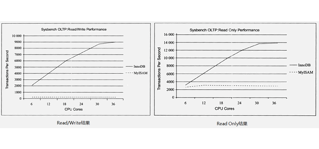 只读模式下,随着 CPU 核数的增加,InnoDB 的读写能力呈线性增长,最高可达近 14000 的 TPS,但 MyISAM 的处理能力不到 3000 TPS
