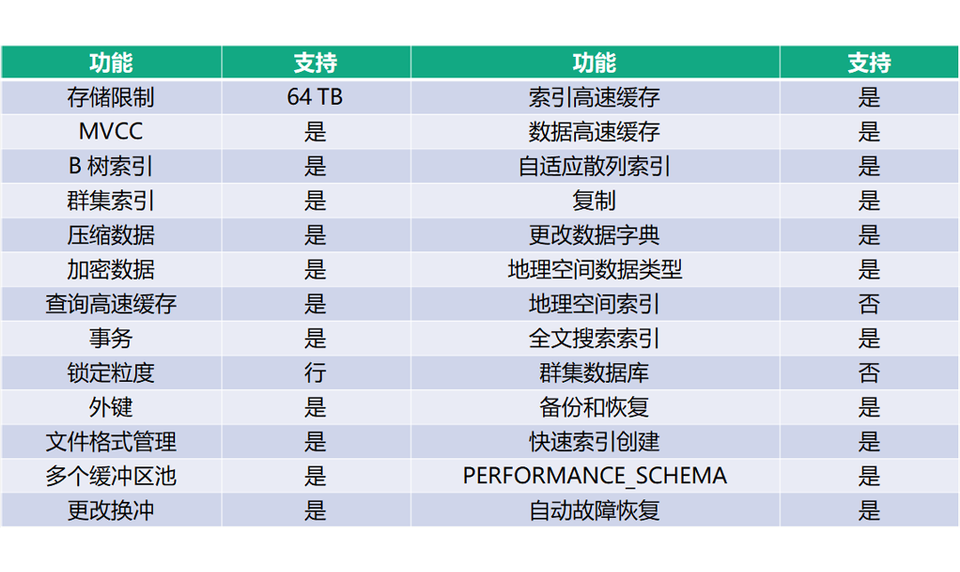 InnoDB 表最大还可以支持 64TB,支持聚簇索引、支持压缩数据存储,支持数据加密,支持查询/索引/数据高速缓存,支持自适应hash索引、空间索引,支持热备份和恢复等。