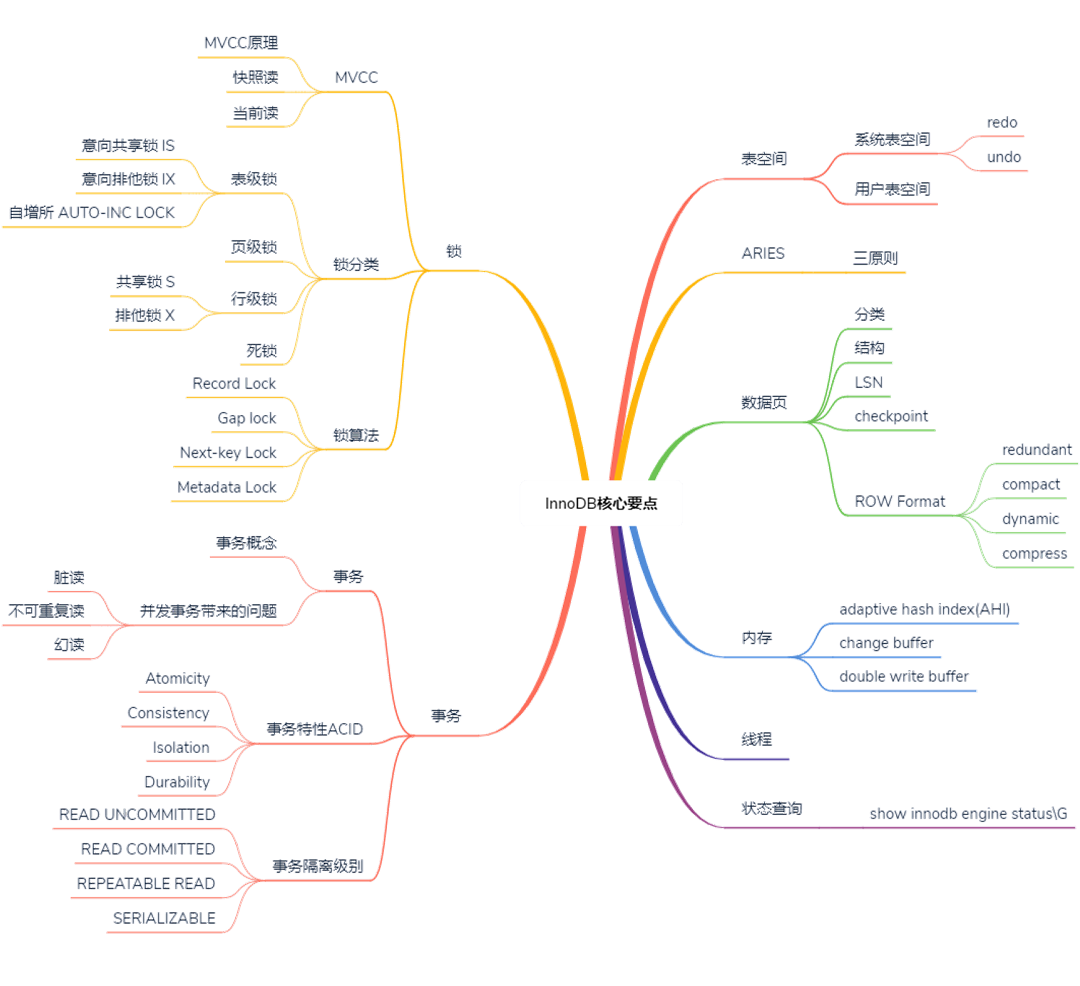 InnoDB 存储引擎的核心特性包括:MVCC、锁、锁算法和分类、事务、表空间和数据页、内存线程以及状态查询。