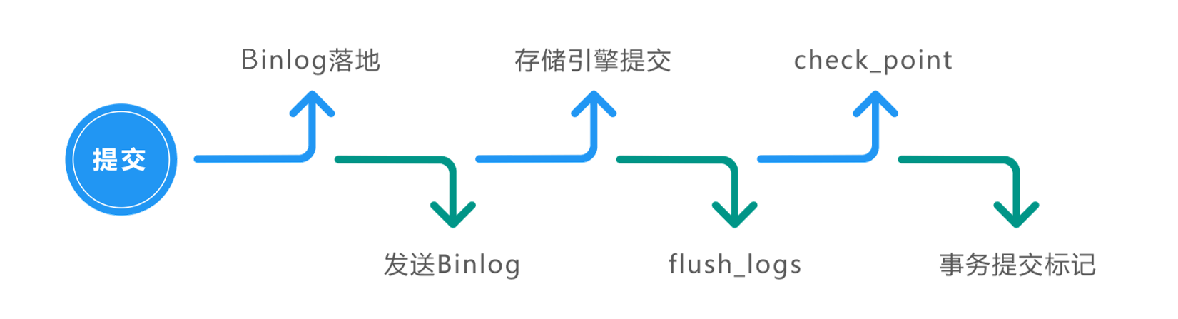如下图所示,一个“提交”动作触发的操作有:binlog 落地、发送 binlog、存储引擎提交、flush_logs, check_point、事务提交标记等。这些都是数据库保证其数据完整性、持久性的手段。
