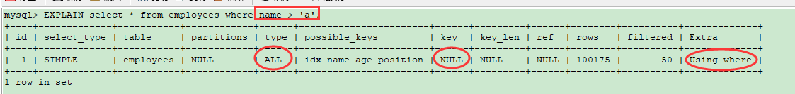 mysql> EXPLAIN select name,age,position from employees where name > 'a' ;