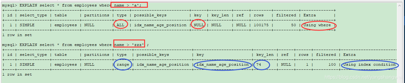 | 1 | SIMPLE | employees | NULL | range | idx_name_age_position | idx_name_age_position | 74 | NULL | 1 | 100 | Using index condition |