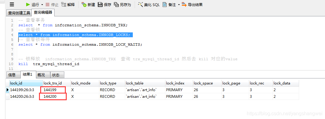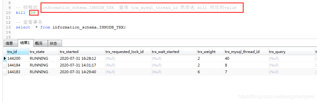 -- 锁释放 information_schema.INNODB_TRX 查询 trx_mysql_thread_id 然后去 kill 对应的value