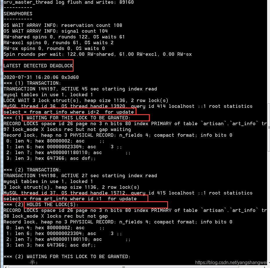 | select * from art_info where id=1 for update; —> Deadlock found when trying to get lock; try restarting transaction |